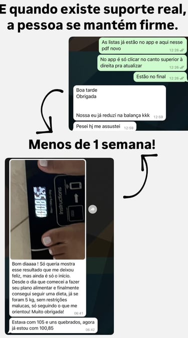 Check-in semanal e Suporte via WhatsApp em horário comercial